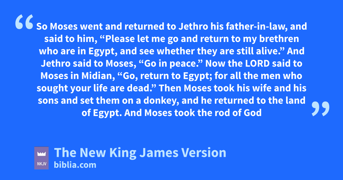 18 So Moses went and returned to rJethro his father-in-law, and said to him, “Please let me go and return to my brethren who are in Egypt, and see whether they are still alive.”