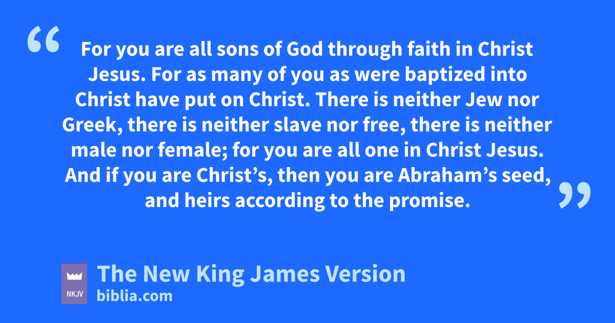 26 For you iare all sons of God through faith in Christ Jesus. 27 For jas many of you as were baptized into Christ khave put on Christ. 28 lThere is neither Jew nor Greek, mthere is neither slave nor free, there is neither male nor female; for you are all none in Christ Jesus. 29 And oif you are Christ’s, then you are Abraham’s pseed, and qheirs according to the promise.
