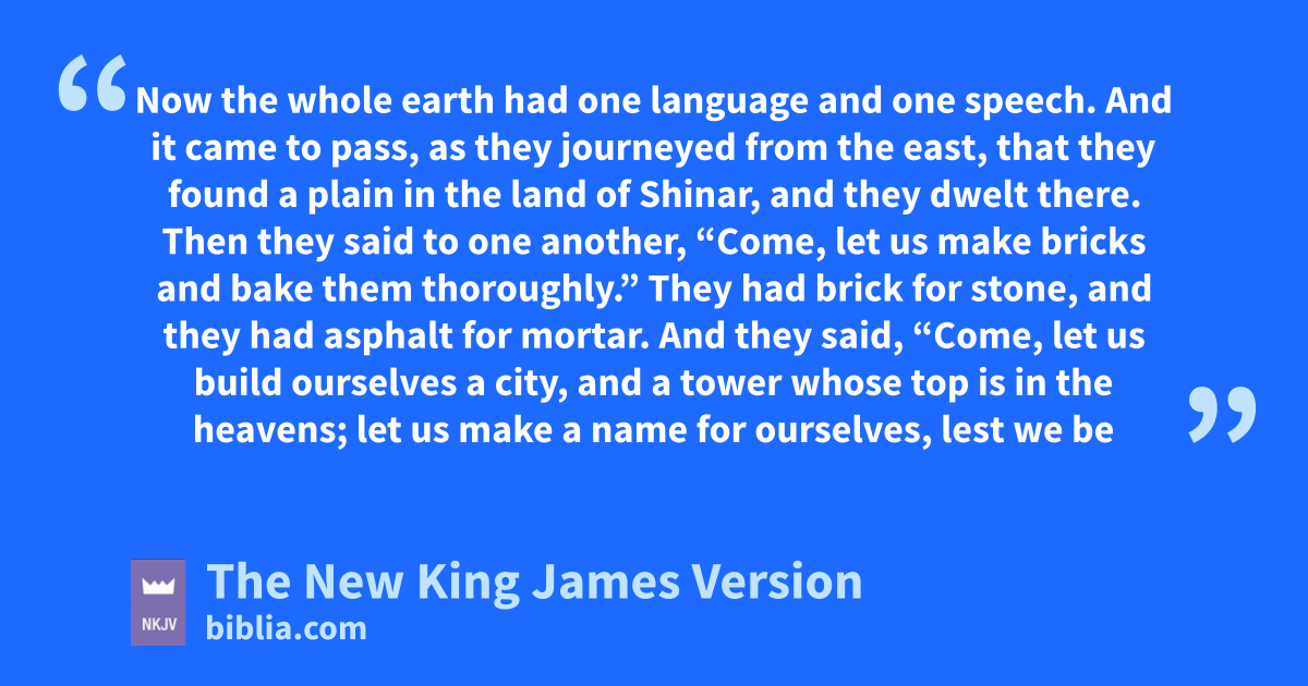 11 Now the whole earth had one language and one 1speech. 2 And it came to pass, as they journeyed from the east, that they found a plain in the land aof Shinar, and they dwelt there. 3 Then they said to one another, “Come, let us make bricks and 2bake them thoroughly.” They had brick for stone, and they had asphalt for mortar. 4 And they said, “Come, let us build ourselves a city, and a tower bwhose top is in the heavens; let us make a cname for ourselves, lest we dbe scattered abroad over the face of the whole earth.”