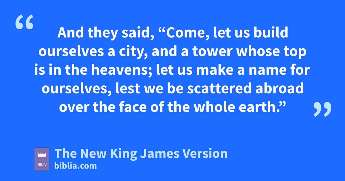 11 Now the whole earth had one language and one 1speech. 2 And it came to pass, as they journeyed from the east, that they found a plain in the land aof Shinar, and they dwelt there. 3 Then they said to one another, “Come, let us make bricks and 2bake them thoroughly.” They had brick for stone, and they had asphalt for mortar. 4 And they said, “Come, let us build ourselves a city, and a tower bwhose top is in the heavens; let us make a cname for ourselves, lest we dbe scattered abroad over the face of the whole earth.”