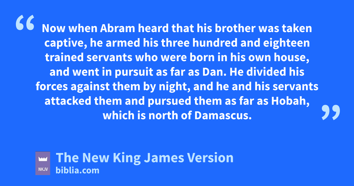 13 Then one who had escaped came and told Abram the qHebrew, for rhe dwelt by 3the terebinth trees of Mamre the Amorite, brother of Eshcol and brother of Aner; sand they were allies with Abram. 14 Now twhen Abram heard that uhis brother was taken captive, he armed his three hundred and eighteen trained servants who were vborn in his own house, and went in pursuit was far as Dan. 15 He divided his forces against them by night, and he and his servants xattacked them and pursued them as far as Hobah, which is 4north of Damascus. 16 So he ybrought back all the goods, and also brought back his brother Lot and his goods, as well as the women and the people.