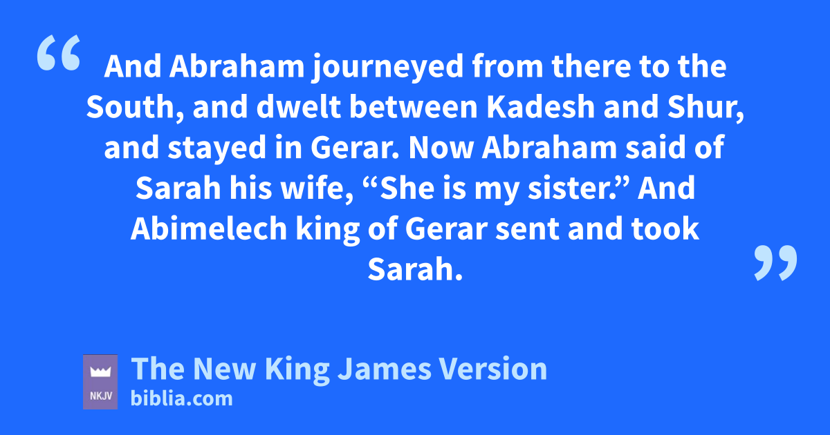 20 And Abraham journeyed from athere to the South, and dwelt between bKadesh and Shur, and cstayed in Gerar. 2 Now Abraham said of Sarah his wife, d“She is my sister.” And Abimelech king of Gerar sent and etook Sarah.
