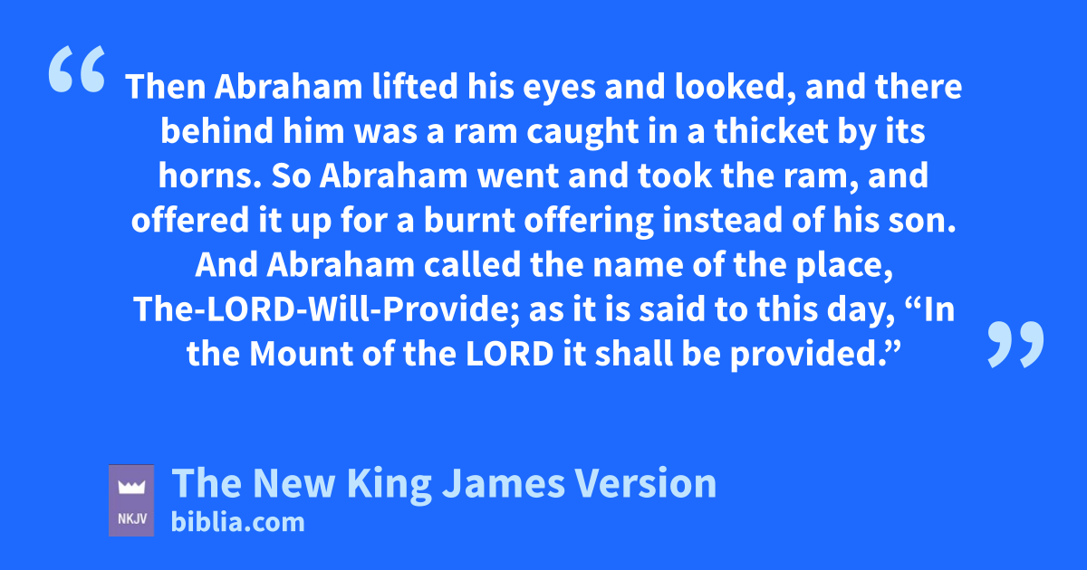 13 Then Abraham lifted his eyes and looked, and there behind him was a ram caught in a thicket by its horns. So Abraham went and took the ram, and offered it up for a burnt offering instead of his son. 14 And Abraham called the name of the place, 3The-Lord-Will-Provide; as it is said to this day, “In the Mount of the Lord it shall be provided.”