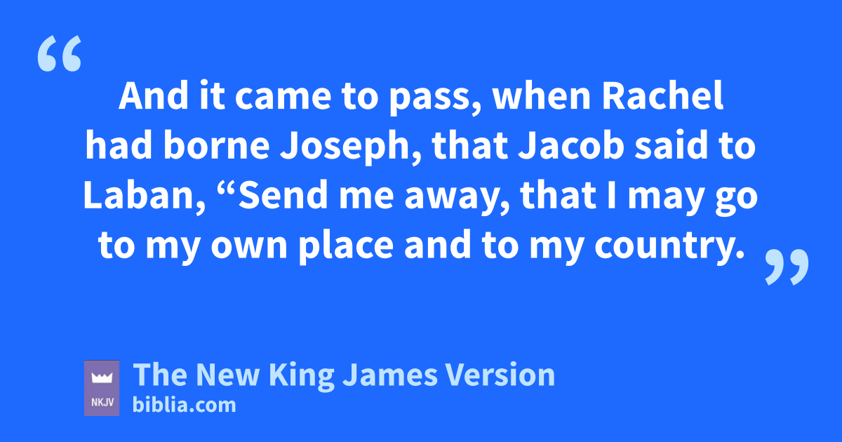 25 And it came to pass, when Rachel had borne Joseph, that Jacob said to Laban, s“Send me away, that I may go to tmy own place and to my country. 26 Give me my wives and my children ufor whom I have served you, and let me go; for you know my service which I have done for you.”