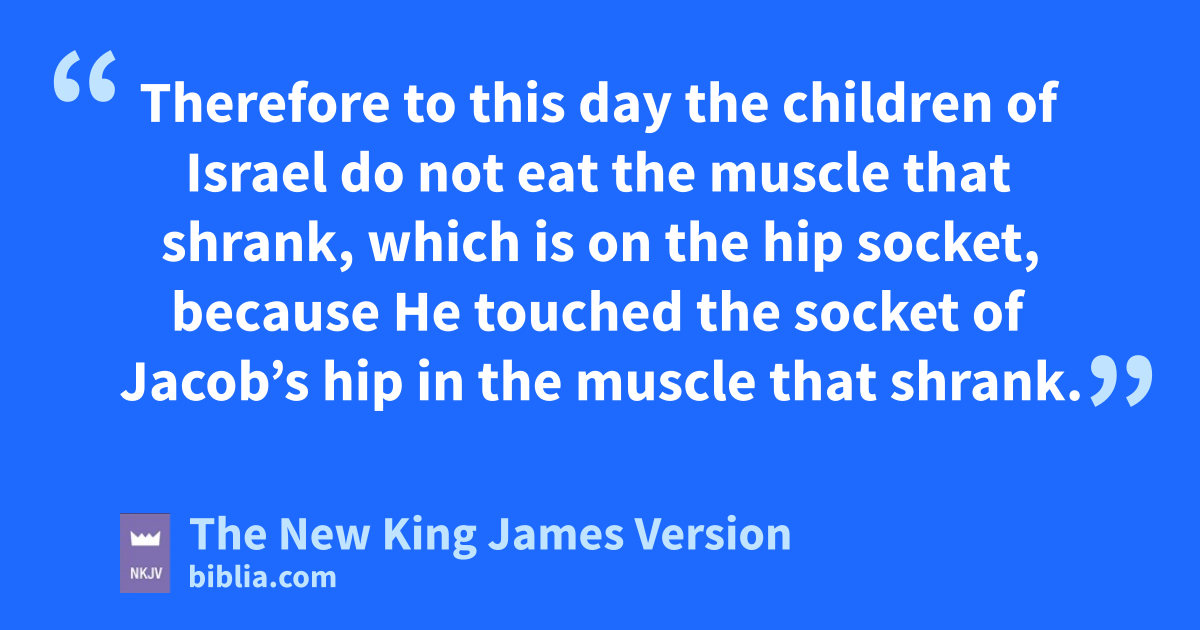 30 So Jacob called the name of the place 1Peniel: “For eI have seen God face to face, and my life is preserved.” 31 Just as he crossed over 2Penuel the sun rose on him, and he limped on his hip. 32 Therefore to this day the children of Israel do not eat the muscle that shrank, which is on the hip socket, because He 3touched the socket of Jacob’s hip in the muscle that shrank.