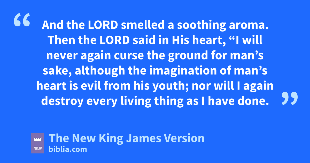 20 Then Noah built an jaltar to the Lord, and took of kevery clean animal and of every clean bird, and offered lburnt offerings on the altar. 21 And the Lord smelled ma soothing aroma. Then the Lord said in His heart, “I will never again ncurse the ground for man’s sake, although the oimagination 1of man’s heart is evil from his youth; pnor will I again destroy every living thing as I have done.