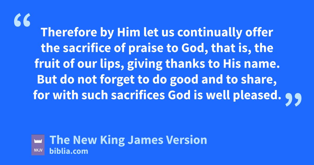 10 We have an altar from which those who serve the tabernacle have no right to eat. 11 For the bodies of those animals, whose blood is brought into the sanctuary by the high priest for sin, are burned outside the camp. 12 Therefore Jesus also, that He might 3sanctify the people with His own blood, suffered outside the gate. 13 Therefore let us go forth to Him, outside the camp, bearing jHis reproach. 14 For here we have no continuing city, but we seek the one to come. 15 kTherefore by Him let us continually offer lthe sacrifice of praise to God, that is, mthe fruit of our lips, 4giving thanks to His name. 16 nBut do not forget to do good and to share, for owith such sacrifices God is well pleased.