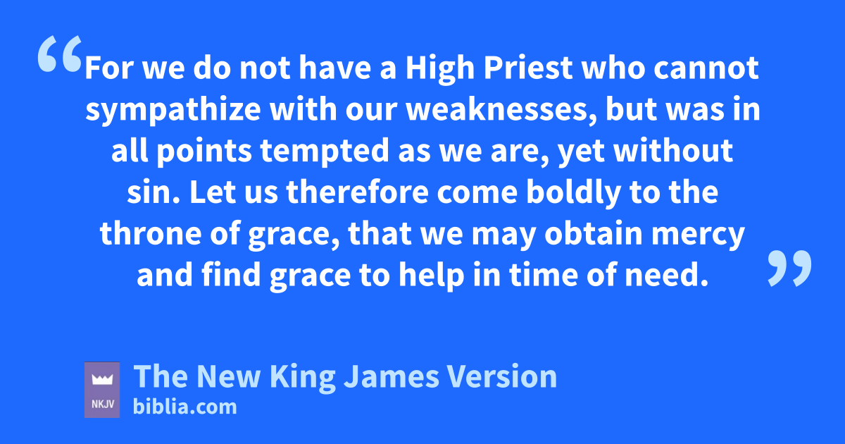 14 Seeing then that we have a great nHigh Priest who has passed through the heavens, Jesus the Son of God, olet us hold fast our confession. 15 For pwe do not have a High Priest who cannot sympathize with our weaknesses, but qwas in all points tempted as we are, ryet without sin. 16 sLet us therefore come boldly to the throne of grace, that we may obtain mercy and find grace to help in time of need.