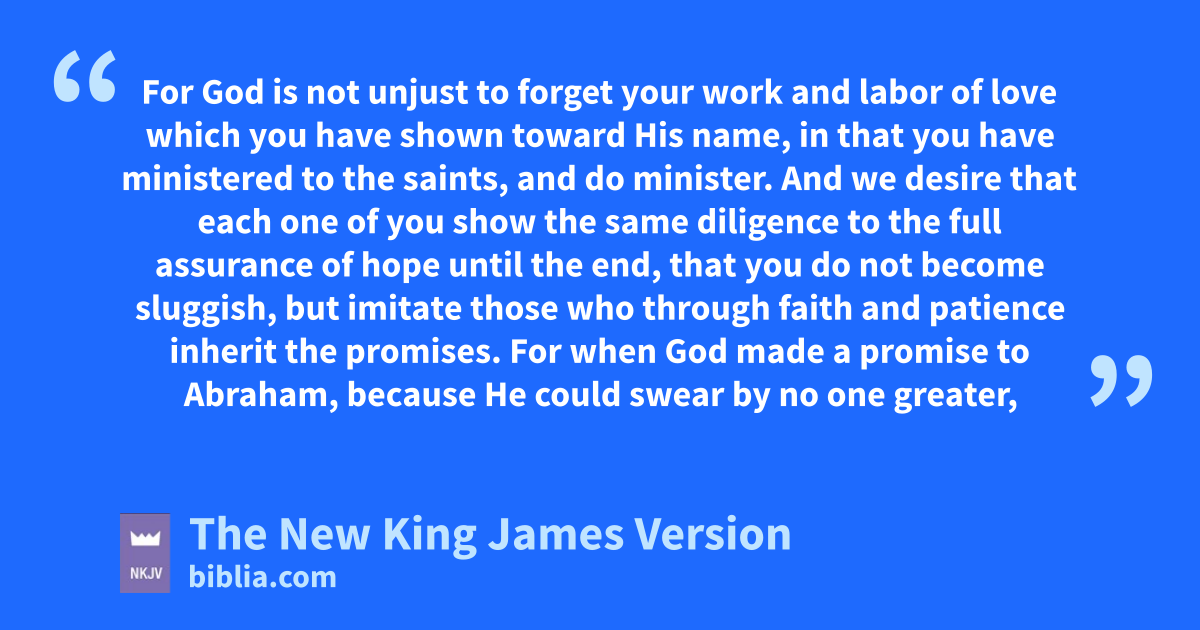 9 But, beloved, we are confident of better things concerning you, yes, things that accompany salvation, though we speak in this manner. 10 For lGod is not unjust to forget myour work and 4labor of love which you have shown toward His name, in that you have nministered to the saints, and do minister. 11 And we desire that each one of you show the same diligence oto the full assurance of hope until the end, 12 that you do not become 5sluggish, but imitate those who through faith and patience pinherit the promises.