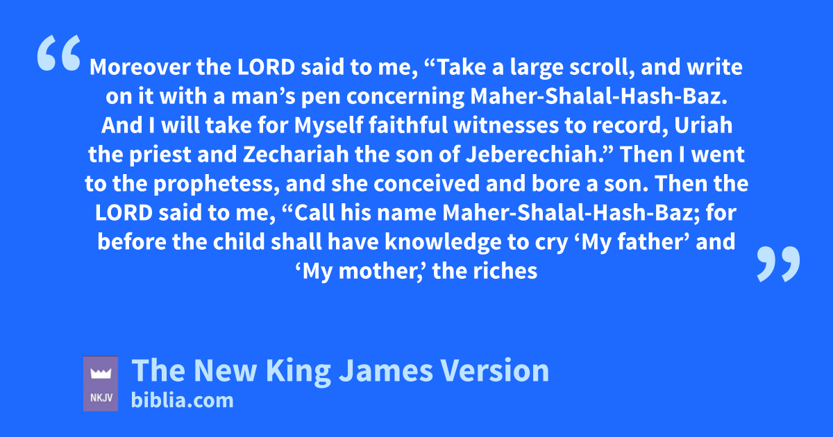 8 Moreover the Lord said to me, “Take a large scroll, and awrite on it with a man’s pen concerning 1Maher-Shalal-Hash-Baz. 2 And I will take for Myself faithful witnesses to record, bUriah the priest and Zechariah the son of Jeberechiah.”