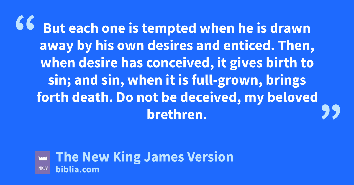 12 kBlessed is the man who endures temptation; for when he has been approved, he will receive lthe crown of life mwhich the Lord has promised to those who love Him. 13 Let no one say when he is tempted, “I am tempted by God”; for God cannot be tempted by evil, nor does He Himself tempt anyone. 14 But each one is tempted when he is drawn away by his own desires and enticed. 15 Then, nwhen desire has conceived, it gives birth to sin; and sin, when it is full-grown, obrings forth death.