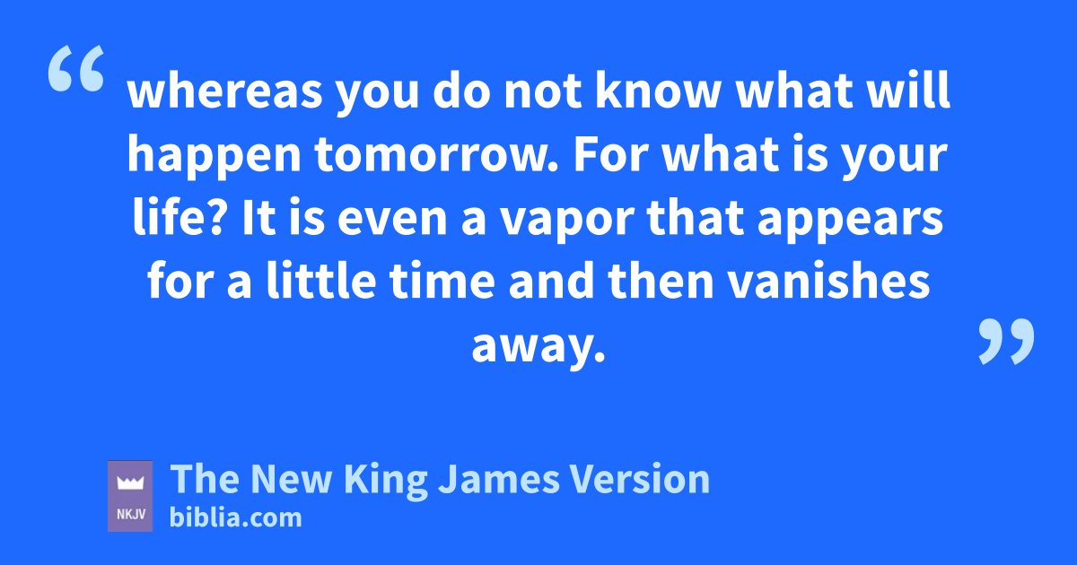 13 Come now, you who say, “Today or tomorrow 8we will go to such and such a city, spend a year there, buy and sell, and make a profit”; 14 whereas you do not know what will happen tomorrow. For what is your life? rIt is even a vapor that appears for a little time and then vanishes away. 15 Instead you ought to say, s“If the Lord wills, we shall live and do this or that.” 16 But now you boast in your arrogance. tAll such boasting is evil.