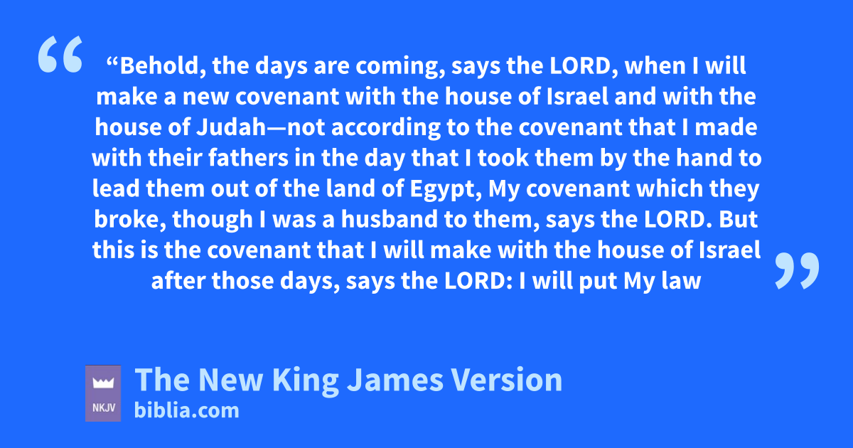 31 “Behold, the wdays are coming, says the Lord, when I will make a new covenant with the house of Israel and with the house of Judah—32 not according to the covenant that I made with their fathers in the day that xI took them by the hand to lead them out of the land of Egypt, My covenant which they broke, 8though I was a husband to them, says the Lord. 33 yBut this is the covenant that I will make with the house of Israel after those days, says the Lord: zI will put My law in their minds, and write it on their 9hearts; aand I will be their God, and they shall be My people. 34 No more shall every man teach his neighbor, and every man his brother, saying, ‘Know the Lord,’ for bthey all shall know Me, from the least of them to the greatest of them, says the Lord. For cI will forgive their iniquity, and their sin I will remember no more.”