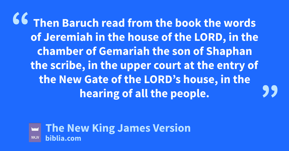 9 Now it came to pass in the fifth year of Jehoiakim the son of Josiah, king of Judah, in the ninth month, that they proclaimed a fast before the Lord to all the people in Jerusalem, and to all the people who came from the cities of Judah to Jerusalem. 10 Then Baruch read from the book the words of Jeremiah in the house of the Lord, in the chamber of Gemariah the son of Shaphan the scribe, in the upper court at the kentry of the New Gate of the Lord’s house, in the 3hearing of all the people.