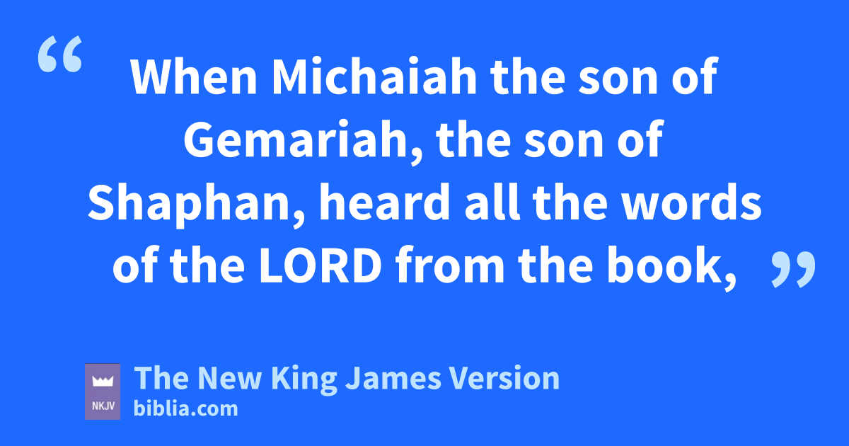 11 When Michaiah the son of Gemariah, the son of Shaphan, heard all the words of the Lord from the book, 12 he then went down to the king’s house, into the scribe’s chamber; and there all the princes were sitting—lElishama the scribe, Delaiah the son of Shemaiah, mElnathan the son of Achbor, Gemariah the son of Shaphan, Zedekiah the son of Hananiah, and all the princes. 13 Then Michaiah declared to them all the words that he had heard when Baruch read the book in the hearing of the people. 14 Therefore all the princes sent Jehudi the son of Nethaniah, the son of Shelemiah, the son of Cushi, to Baruch, saying, “Take in your hand the scroll from which you have read in the hearing of the people, and come.” So Baruch the son of Neriah took the scroll in his hand and came to them. 15 And they said to him, “Sit down now, and read it in our hearing.” So Baruch read it in their hearing.