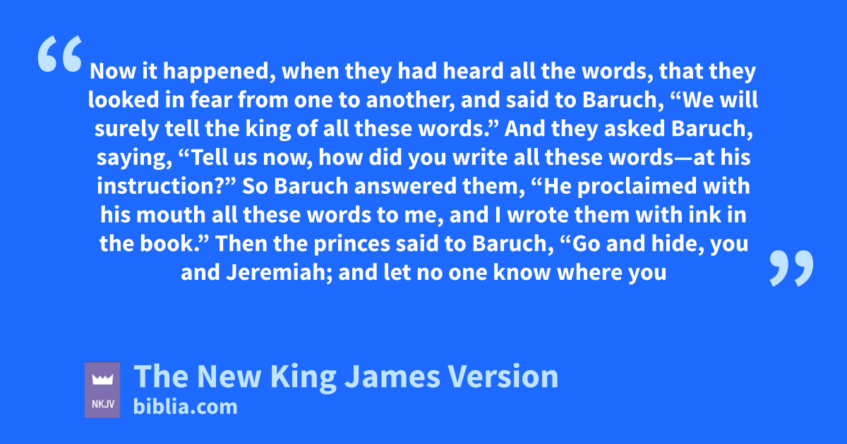16 Now it happened, when they had heard all the words, that they looked in fear from one to another, and said to Baruch, “We will surely tell the king of all these words.” 17 And they asked Baruch, saying, “Tell us now, how did you write all these words—4at his instruction?”