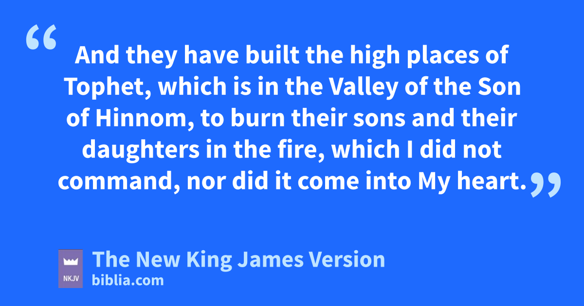 28 “So you shall say to them, ‘This is a nation that does not obey the voice of the Lord their God nnor receive correction. oTruth has perished and has been cut off from their mouth. 29 pCut off your hair and cast it away, and take up a lamentation on the desolate heights; for the Lord has rejected and forsaken the generation of His wrath.’ 30 For the children of Judah have done evil in My sight,” says the Lord. q“They have set their abominations in the house which is called by My name, to 5pollute it. 31 And they have built the rhigh places of Tophet, which is in the Valley of the Son of Hinnom, to sburn their sons and their daughters in the fire, twhich I did not command, nor did it come into My heart.