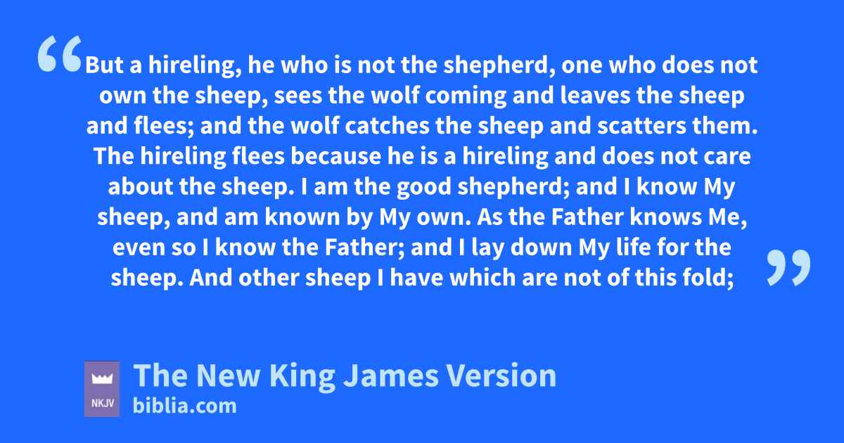 11 d“I am the good shepherd. The good shepherd gives His life for the sheep. 12 But a 2hireling, he who is not the shepherd, one who does not own the sheep, sees the wolf coming and eleaves the sheep and flees; and the wolf catches the sheep and scatters them. 13 The hireling flees because he is a hireling and does not care about the sheep. 14 I am the good shepherd; and fI know My sheep, and gam known by My own. 15 hAs the Father knows Me, even so I know the Father; iand I lay down My life for the sheep. 16 And jother sheep I have which are not of this fold; them also I must bring, and they will hear My voice; kand there will be one flock and one shepherd.