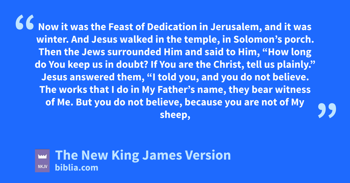 22 Now it was the Feast of Dedication in Jerusalem, and it was winter. 23 And Jesus walked in the temple, tin Solomon’s porch. 24 Then the Jews surrounded Him and said to Him, “How long do You keep us in 4doubt? If You are the Christ, tell us plainly.”