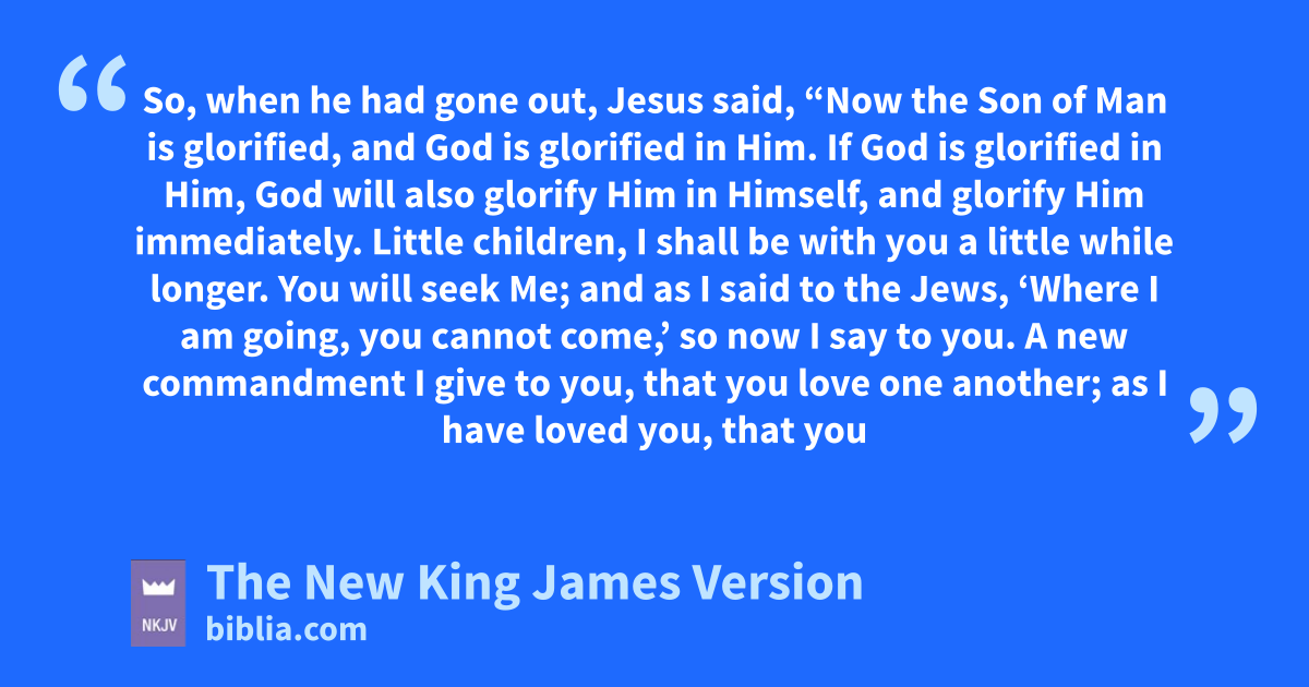 31 So, when he had gone out, Jesus said, f“Now the Son of Man is glorified, and gGod is glorified in Him. 32 If God is glorified in Him, God will also glorify Him in Himself, and hglorify Him immediately. 33 Little children, I shall be with you a ilittle while longer. You will seek Me; jand as I said to the Jews, ‘Where I am going, you cannot come,’ so now I say to you. 34 kA new commandment I give to you, that you love one another; as I have loved you, that you also love one another. 35 lBy this all will know that you are My disciples, if you have love for one another.”
