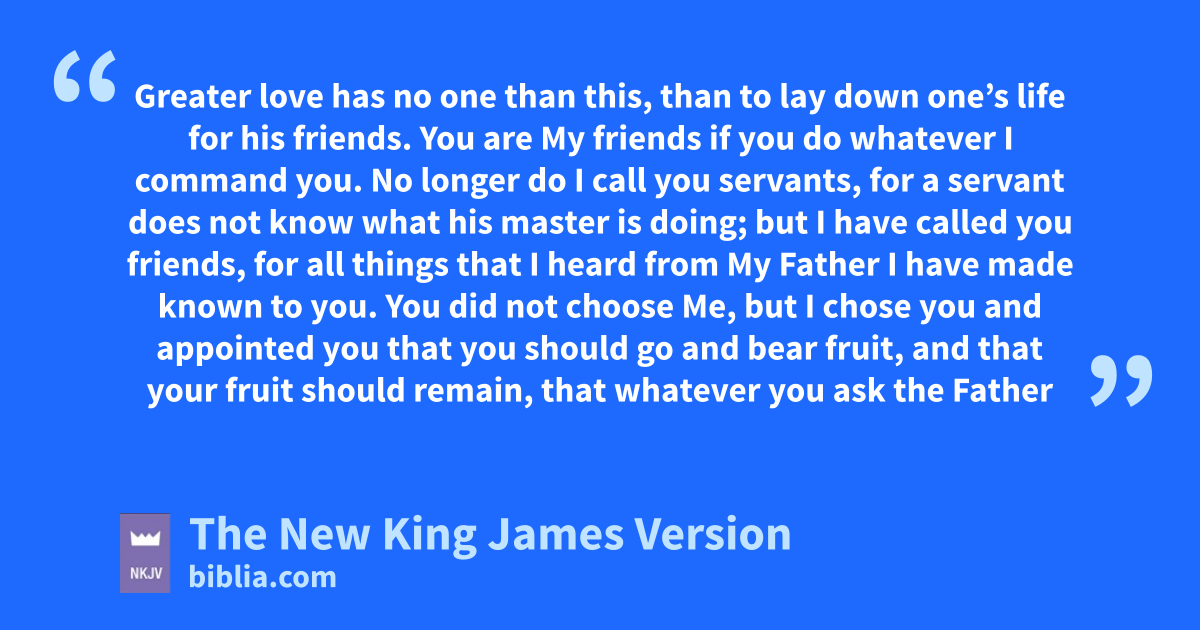 12 oThis is My pcommandment, that you love one another as I have loved you. 13 qGreater love has no one than this, than to lay down one’s life for his friends. 14 rYou are My friends if you do whatever I command you. 15 No longer do I call you servants, for a servant does not know what his master is doing; but I have called you friends, sfor all things that I heard from My Father I have made known to you. 16 tYou did not choose Me, but I chose you and uappointed you that you should go and bear fruit, and that your fruit should remain, that whatever you ask the Father vin My name He may give you. 17 These things I command you, that you love one another.