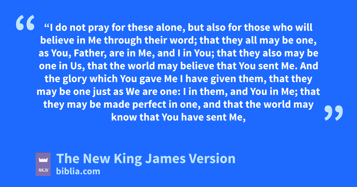 20 “I do not pray for these alone, but also for those who 1will believe in Me through their word; 21 gthat they all may be one, as hYou, Father, are in Me, and I in You; that they also may be one in Us, that the world may believe that You sent Me. 22 And the iglory which You gave Me I have given them, jthat they may be one just as We are one: 23 I in them, and You in Me; kthat they may be made perfect in one, and that the world may know that You have sent Me, and have loved them as You have loved Me.