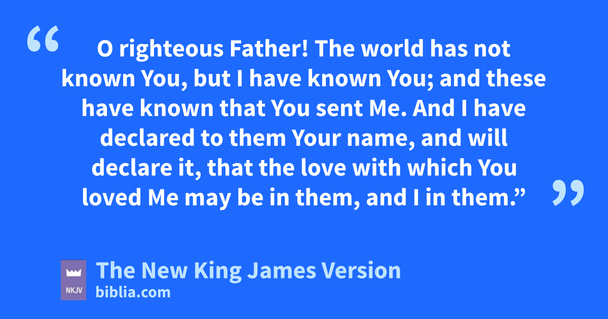 24 l“Father, I desire that they also whom You gave Me may be with Me where I am, that they may behold My glory which You have given Me; mfor You loved Me before the foundation of the world. 25 O righteous Father! nThe world has not known You, but oI have known You; and pthese have known that You sent Me. 26 qAnd I have declared to them Your name, and will declare it, that the love rwith which You loved Me may be in them, and I in them.”