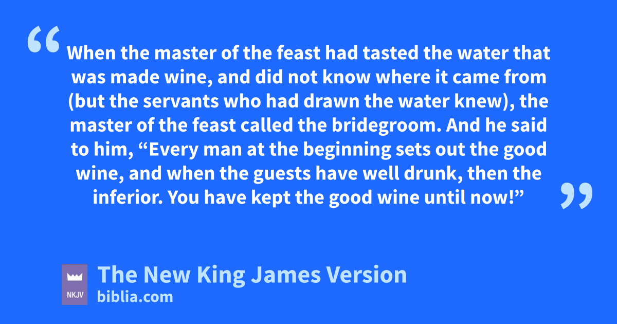 6 Now there were set there six waterpots of stone, gaccording to the manner of purification of the Jews, containing twenty or thirty gallons apiece. 7 Jesus said to them, “Fill the waterpots with water.” And they filled them up to the brim. 8 And He said to them, “Draw some out now, and take it to the master of the feast.” And they took it. 9 When the master of the feast had tasted hthe water that was made wine, and did not know where it came from (but the servants who had drawn the water knew), the master of the feast called the bridegroom. 10 And he said to him, “Every man at the beginning sets out the good wine, and when the guests have well drunk, then the inferior. You have kept the good wine until now!”
