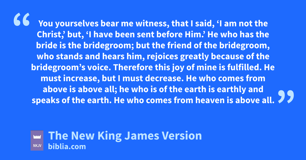 27 John answered and said, c“A man can receive nothing unless it has been given to him from heaven. 28 You yourselves bear me witness, that I said, d‘I am not the Christ,’ but, e‘I have been sent before Him.’ 29 fHe who has the bride is the bridegroom; but gthe friend of the bridegroom, who stands and hears him, rejoices greatly because of the bridegroom’s voice. Therefore this joy of mine is fulfilled. 30 hHe must increase, but I must decrease. 31 iHe who comes from above jis above all; khe who is of the earth is earthly and speaks of the earth. lHe who comes from heaven is above all. 32 And mwhat He has seen and heard, that He testifies; and no one receives His testimony. 33 He who has received His testimony nhas certified that God is true. 34 oFor He whom God has sent speaks the words of God, for God does not give the Spirit pby measure. 35 qThe Father loves the Son, and has given all things into His hand. 36 rHe who believes in the Son has everlasting life; and he who does not believe the Son shall not see life, but the swrath of God abides on him.”