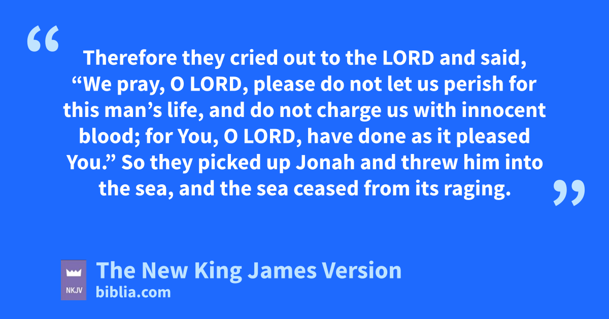 13 Nevertheless the men rowed hard to return to land, pbut they could not, for the sea continued to grow more tempestuous against them. 14 Therefore they cried out to the Lord and said, “We pray, O Lord, please do not let us perish for this man’s life, and qdo not charge us with innocent blood; for You, O Lord, rhave done as it pleased You.” 15 So they picked up Jonah and threw him into the sea, sand the sea ceased from its raging. 16 Then the men tfeared the Lord exceedingly, and offered a sacrifice to the Lord and took vows.