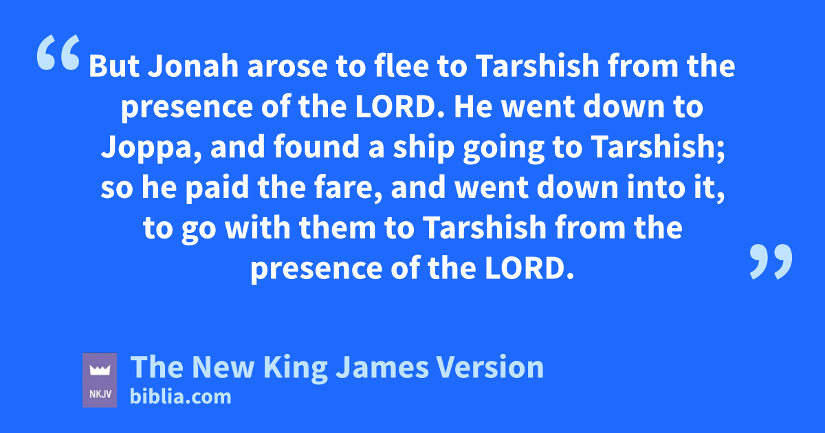 1 Now the word of the Lord came to aJonah the son of Amittai, saying, 2 “Arise, go to bNineveh, that cgreat city, and cry out against it; for dtheir wickedness has come up before Me.” 3 But Jonah arose to flee to Tarshish from the presence of the Lord. He went down to eJoppa, and found a ship going to Tarshish; so he paid the fare, and went down into it, to go with them to fTarshish gfrom the presence of the Lord.