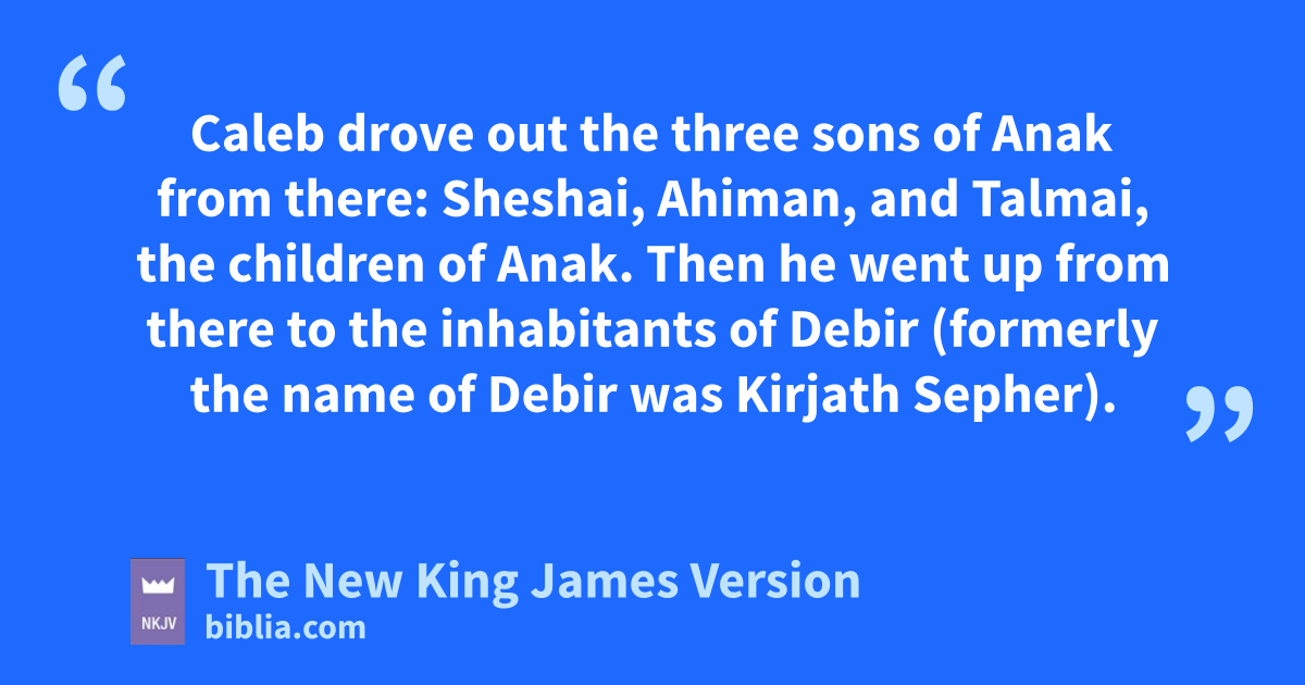 13 uNow to Caleb the son of Jephunneh he gave a share among the children of vJudah, according to the commandment of the Lord to Joshua, namely, wKirjath Arba, which is Hebron (Arba was the father of Anak). 14 Caleb drove out xthe three sons of Anak from there: ySheshai, Ahiman, and Talmai, the children of Anak. 15 Then zhe went up from there to the inhabitants of Debir (formerly the name of Debir was Kirjath Sepher).