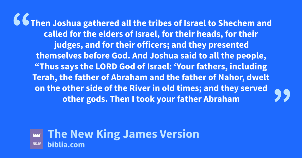 24 Then Joshua gathered all the tribes of Israel to aShechem and bcalled for the elders of Israel, for their heads, for their judges, and for their officers; and they cpresented themselves before God. 2 And Joshua said to all the people, “Thus says the Lord God of Israel: d‘Your fathers, including Terah, the father of Abraham and the father of Nahor, dwelt on the other side of 1the River in old times; and ethey served other gods. 3 fThen I took your father Abraham from the other side of 2the River, led him throughout all the land of Canaan, and multiplied his 3descendants and ggave him Isaac. 4 To Isaac I gave hJacob and Esau. To iEsau I gave the mountains of Seir to possess, jbut Jacob and his children went down to Egypt. 5 kAlso I sent Moses and Aaron, and lI plagued Egypt, according to what I did among them. Afterward I brought you out.