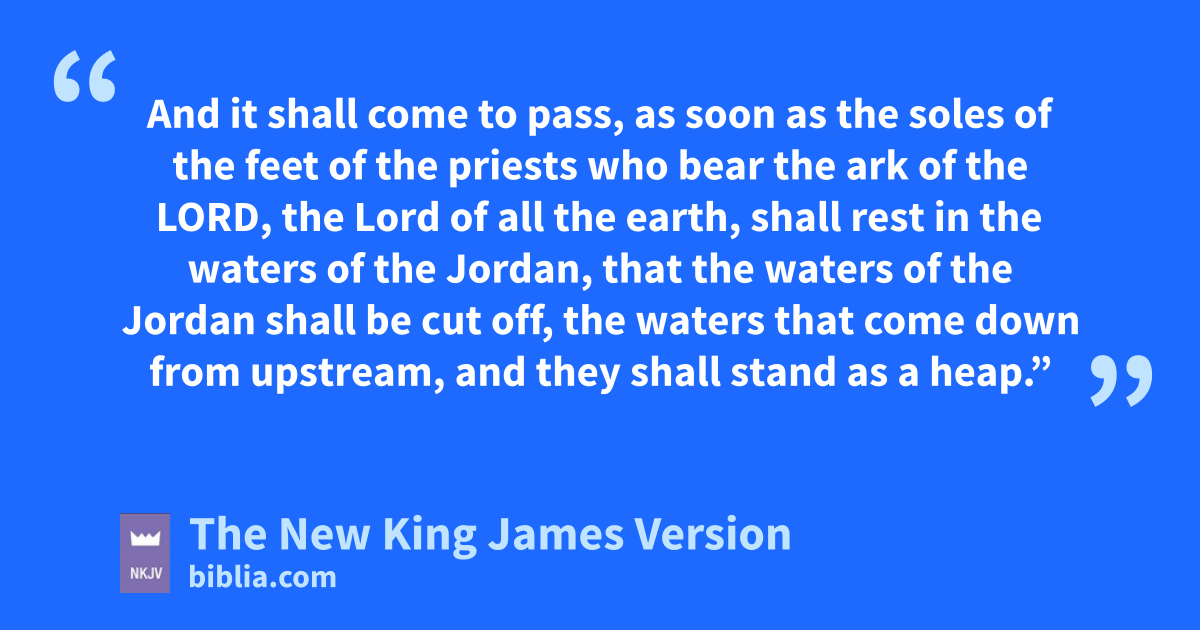 9 So Joshua said to the children of Israel, “Come here, and hear the words of the Lord your God.” 10 And Joshua said, “By this you shall know that lthe living God is among you, and that He will without fail mdrive out from before you the nCanaanites and the Hittites and the Hivites and the Perizzites and the Girgashites and the Amorites and the Jebusites: 11 Behold, the ark of the covenant of othe Lord of all the earth is crossing over before you into the Jordan. 12 Now therefore, ptake for yourselves twelve men from the tribes of Israel, one man from every tribe. 13 And it shall come to pass, qas soon as the soles of the feet of the priests who bear the ark of the Lord, rthe Lord of all the earth, shall rest in the waters of the Jordan, that the waters of the Jordan shall be cut off, the waters that come down from upstream, and they sshall stand as a heap.”