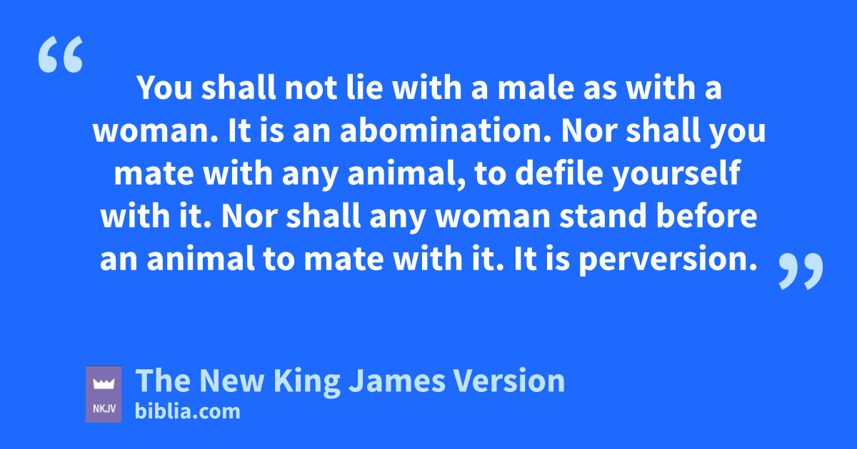 19 ‘Also you shall not approach a woman to uncover her nakedness as klong as she is in her lcustomary impurity. 20 mMoreover you shall not lie carnally with your nneighbor’s wife, to defile yourself with her. 21 And you shall not let any of your descendants opass through pthe fire to qMolech, nor shall you profane the name of your God: I am the Lord. 22 You shall not lie with ra male as with a woman. It is an abomination. 23 Nor shall you mate with any sanimal, to defile yourself with it. Nor shall any woman stand before an animal to mate with it. It is perversion.