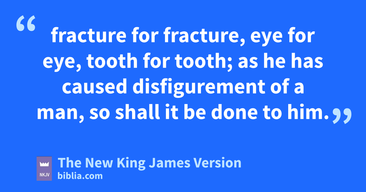 19 ‘If a man causes disfigurement of his neighbor, as she has done, so shall it be done to him—20 fracture for tfracture, ueye for eye, tooth for tooth; as he has caused disfigurement of a man, so shall it be done to him. 21 And whoever kills an animal shall restore it; but whoever kills a man shall be put to death. 22 You shall have vthe 5same law for the stranger and for one from your own country; for I am the Lord your God.’ ”