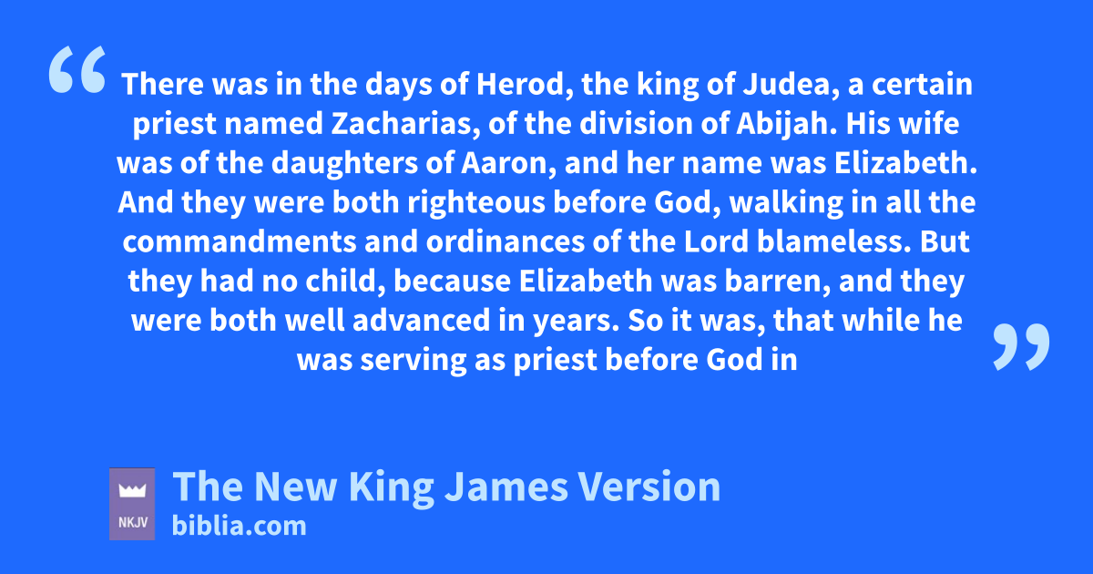 5 There was gin the days of Herod, the king of Judea, a certain priest named Zacharias, hof the division of iAbijah. His jwife was of the daughters of Aaron, and her name was Elizabeth. 6 And they were both righteous before God, walking in all the commandments and ordinances of the Lord blameless. 7 But they had no child, because Elizabeth was barren, and they were both well advanced in years.