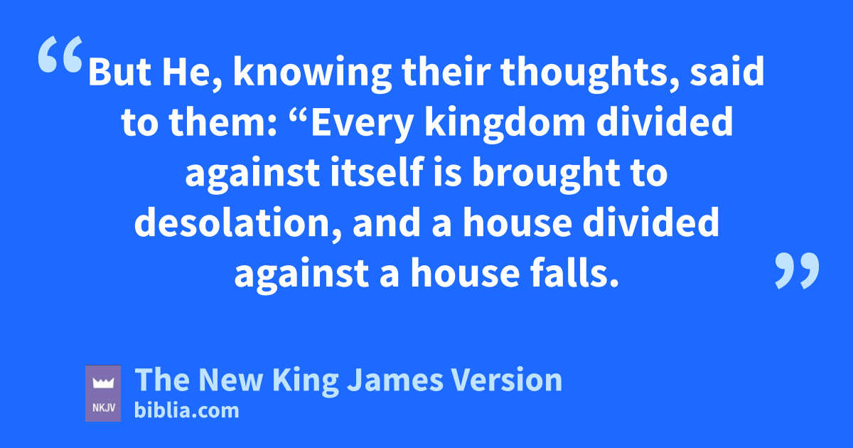 16 Others, testing Him, jsought from Him a sign from heaven. 17 kBut lHe, knowing their thoughts, said to them: “Every kingdom divided against itself is brought to desolation, and a house divided against a house falls. 18 If Satan also is divided against himself, how will his kingdom stand? Because you say I cast out demons by Beelzebub. 19 And if I cast out demons by Beelzebub, by whom do your sons cast them out? Therefore they will be your judges. 20 But if I cast out demons mwith the finger of God, surely the kingdom of God has come upon you. 21 nWhen a strong man, fully armed, guards his own palace, his goods are in peace. 22 But owhen a stronger than he comes upon him and overcomes him, he takes from him all his armor in which he trusted, and divides his 7spoils. 23 pHe who is not with Me is against Me, and he who does not gather with Me scatters.