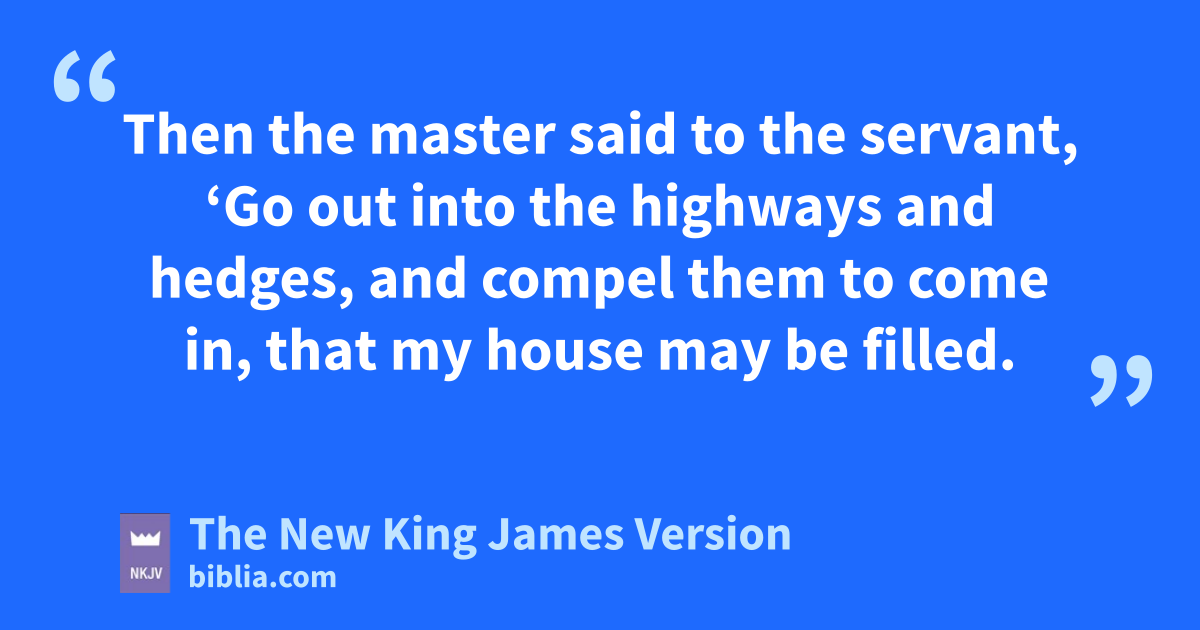 16 hThen He said to him, “A certain man gave a great supper and invited many, 17 and isent his servant at supper time to say to those who were invited, ‘Come, for all things are now ready.’ 18 But they all with one accord began to make excuses. The first said to him, ‘I have bought a piece of ground, and I must go and see it. I ask you to have me excused.’ 19 And another said, ‘I have bought five yoke of oxen, and I am going to test them. I ask you to have me excused.’ 20 Still another said, ‘I have married a wife, and therefore I cannot come.’ 21 So that servant came and reported these things to his master. Then the master of the house, being angry, said to his servant, ‘Go out quickly into the streets and lanes of the city, and bring in here the poor and the 6maimed and the lame and the blind.’ 22 And the servant said, ‘Master, it is done as you commanded, and still there is room.’ 23 Then the master said to the servant, ‘Go out into the highways and hedges, and compel them to come in, that my house may be filled. 24 For I say to you jthat none of those men who were invited shall taste my supper.’ ”