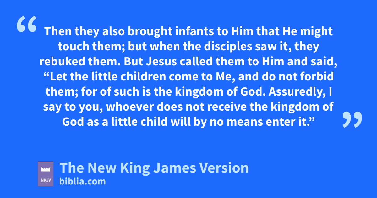 15 iThen they also brought infants to Him that He might touch them; but when the disciples saw it, they rebuked them. 16 But Jesus called them to Him and said, “Let the little children come to Me, and do not forbid them; for jof such is the kingdom of God. 17 kAssuredly, I say to you, whoever does not receive the kingdom of God as a little child will by no means enter it.”