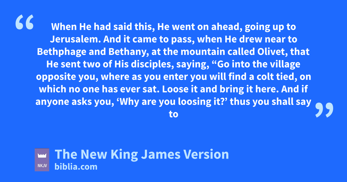 28 When He had said this, sHe went on ahead, going up to Jerusalem. 29 tAnd it came to pass, when He drew near to 7Bethphage and uBethany, at the mountain called vOlivet, that He sent two of His disciples, 30 saying, “Go into the village opposite you, where as you enter you will find a colt tied, on which no one has ever sat. Loose it and bring it here. 31 And if anyone asks you, ‘Why are you loosing it?’ thus you shall say to him, ‘Because the Lord has need of it.’ ”