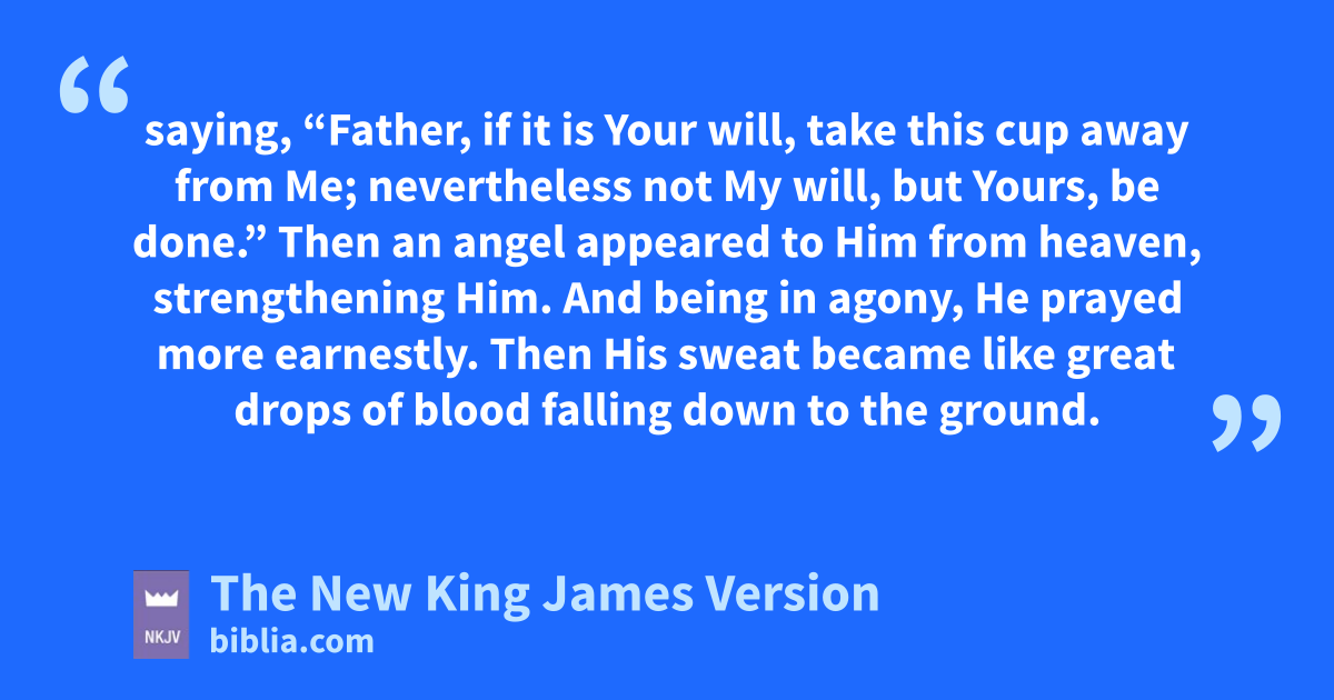 41 nAnd He was withdrawn from them about a stone’s throw, and He knelt down and prayed, 42 saying, “Father, if it is Your will, take this cup away from Me; nevertheless onot My will, but Yours, be done.” 43 6Then pan angel appeared to Him from heaven, strengthening Him. 44 qAnd being in agony, He prayed more earnestly. Then His sweat became like great drops of blood falling down to the ground.