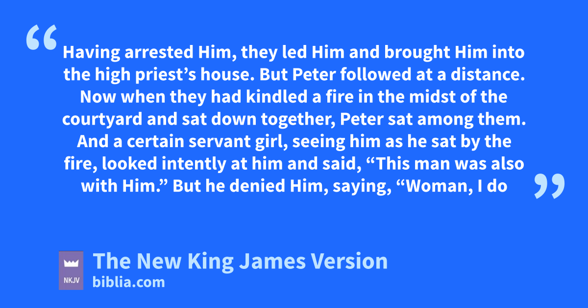 54 bHaving arrested Him, they led Him and brought Him into the high priest’s house. cBut Peter followed at a distance. 55 dNow when they had kindled a fire in the midst of the courtyard and sat down together, Peter sat among them. 56 And a certain servant girl, seeing him as he sat by the fire, looked intently at him and said, “This man was also with Him.”