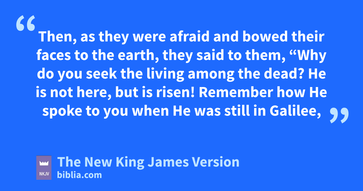 24 Now aon the first day of the week, very early in the morning, they, 1and certain other women with them, came to the tomb bbringing the spices which they had prepared. 2 cBut they found the stone rolled away from the tomb. 3 dThen they went in and did not find the body of the Lord Jesus. 4 And it happened, as they were 2greatly perplexed about this, that ebehold, two men stood by them in shining garments. 5 Then, as they were afraid and bowed their faces to the earth, they said to them, “Why do you seek the living among the dead? 6 He is not here, but is risen! fRemember how He spoke to you when He was still in Galilee, 7 saying, ‘The Son of Man must be gdelivered into the hands of sinful men, and be crucified, and the third day rise again.’ ”