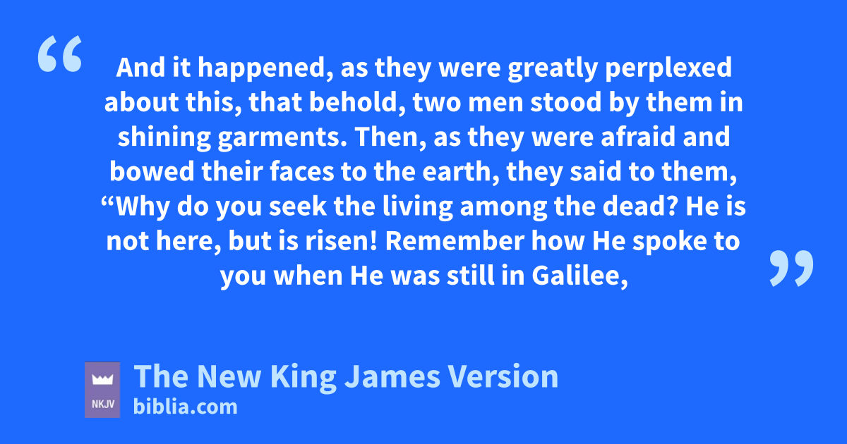 24 Now aon the first day of the week, very early in the morning, they, 1and certain other women with them, came to the tomb bbringing the spices which they had prepared. 2 cBut they found the stone rolled away from the tomb. 3 dThen they went in and did not find the body of the Lord Jesus. 4 And it happened, as they were 2greatly perplexed about this, that ebehold, two men stood by them in shining garments. 5 Then, as they were afraid and bowed their faces to the earth, they said to them, “Why do you seek the living among the dead? 6 He is not here, but is risen! fRemember how He spoke to you when He was still in Galilee, 7 saying, ‘The Son of Man must be gdelivered into the hands of sinful men, and be crucified, and the third day rise again.’ ”
