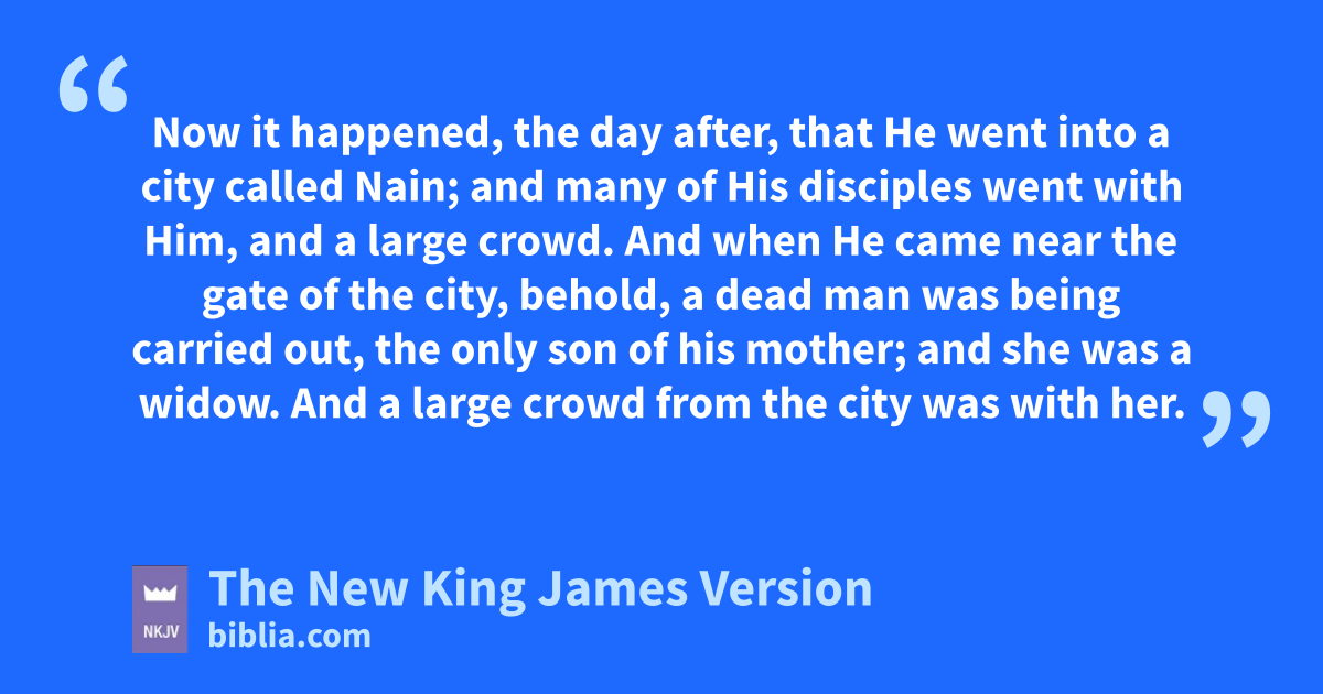 11 Now it happened, the day after, that He went into a city called Nain; and many of His disciples went with Him, and a large crowd. 12 And when He came near the gate of the city, behold, a dead man was being carried out, the only son of his mother; and she was a widow. And a large crowd from the city was with her. 13 When the Lord saw her, He had dcompassion on her and said to her, e“Do not weep.” 14 Then He came and touched the open coffin, and those who carried him stood still. And He said, “Young man, I say to you, farise.” 15 So he who was dead gsat up and began to speak. And He hpresented him to his mother.