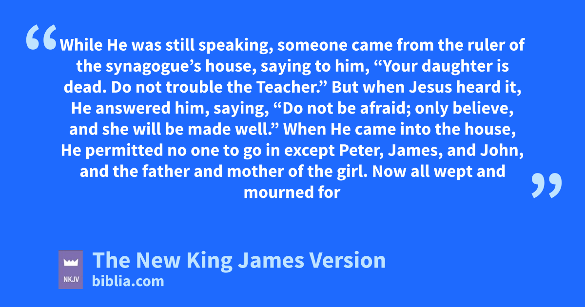 50 But when Jesus heard it, He answered him, saying, “Do not be afraid; ronly believe, and she will be made well.” 51 When He came into the house, He permitted no one to go 1in except 2Peter, James, and John, and the father and mother of the girl. 52 Now all wept and mourned for her; but He said, s“Do not weep; she is not dead, tbut sleeping.” 53 And they ridiculed Him, knowing that she was dead.