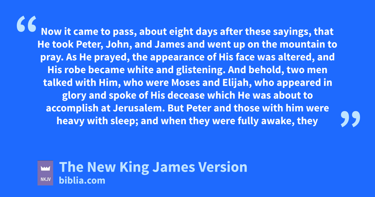 28 zNow it came to pass, about eight days after these sayings, that He took Peter, John, and James and went up on the mountain to pray. 29 As He prayed, the appearance of His face was altered, and His robe became white and glistening. 30 And behold, two men talked with Him, who were aMoses and bElijah, 31 who appeared in glory and spoke of His 3decease which He was about to accomplish at Jerusalem. 32 But Peter and those with him cwere heavy with sleep; and when they were fully awake, they saw His glory and the two men who stood with Him. 33 Then it happened, as they were parting from Him, that Peter said to Jesus, “Master, it is good for us to be here; and let us make three 4tabernacles: one for You, one for Moses, and one for Elijah”—not knowing what he said.