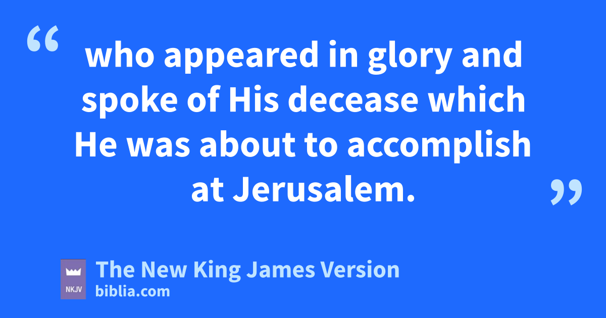 28 zNow it came to pass, about eight days after these sayings, that He took Peter, John, and James and went up on the mountain to pray. 29 As He prayed, the appearance of His face was altered, and His robe became white and glistening. 30 And behold, two men talked with Him, who were aMoses and bElijah, 31 who appeared in glory and spoke of His 3decease which He was about to accomplish at Jerusalem. 32 But Peter and those with him cwere heavy with sleep; and when they were fully awake, they saw His glory and the two men who stood with Him. 33 Then it happened, as they were parting from Him, that Peter said to Jesus, “Master, it is good for us to be here; and let us make three 4tabernacles: one for You, one for Moses, and one for Elijah”—not knowing what he said.