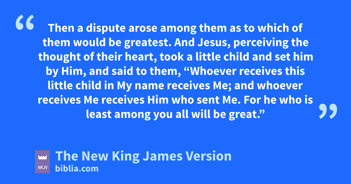 46 kThen a dispute arose among them as to which of them would be greatest. 47 And Jesus, lperceiving the thought of their heart, took a mlittle child and set him by Him, 48 and said to them, n“Whoever receives this little child in My name receives Me; and owhoever receives Me preceives Him who sent Me. qFor he who is least among you all will be great.”